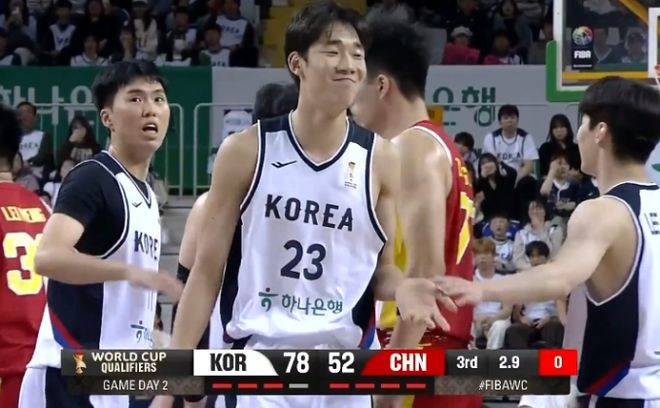 易边再战,高诗岩与李贤重率先对攻一记三分,程帅澎上篮追分,韩国男篮连续罚中5球。程帅澎三分命中,李贤重引领一波9-0攻势扩大32分领先优势,胡金秋上篮追分,朱俊龙三分三不沾。河允基上篮命中,程帅澎连中两记三分与胡金秋上篮打停对手,李政炫抛射命中。胡金秋补篮2+1,程帅澎违体犯规送李沅锡两罚全中,李政炫第5记三分命中,胡金秋补篮再追2分,韩国男篮罚球再得2分,三节结束中国男篮52-80落后韩国男篮。前三节比赛,程帅澎19分与胡金秋14分,李政炫21分与李贤重20分、河允基14分。