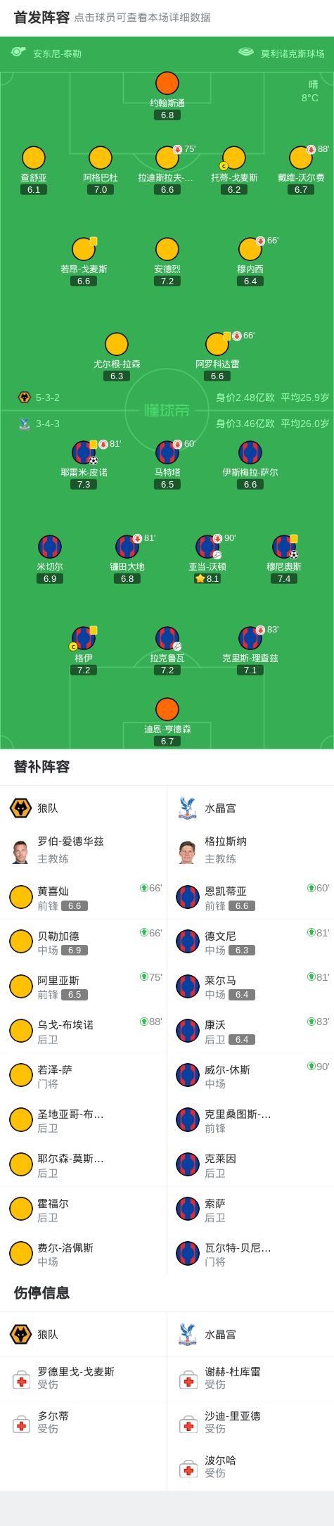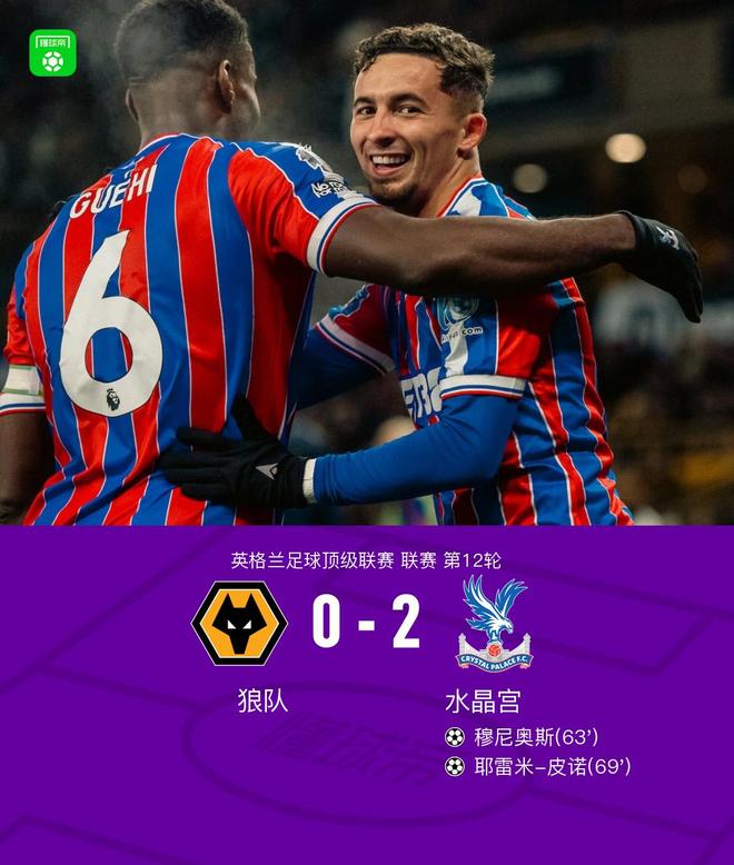 北京时间11月22日,英格兰足球超级联赛第12轮展开较量,狼队坐镇主场迎战水晶宫。比赛中,穆尼奥斯乱战破门打破僵局,皮诺轰世界波再下一城。最终,水晶宫2-0客胜狼队。