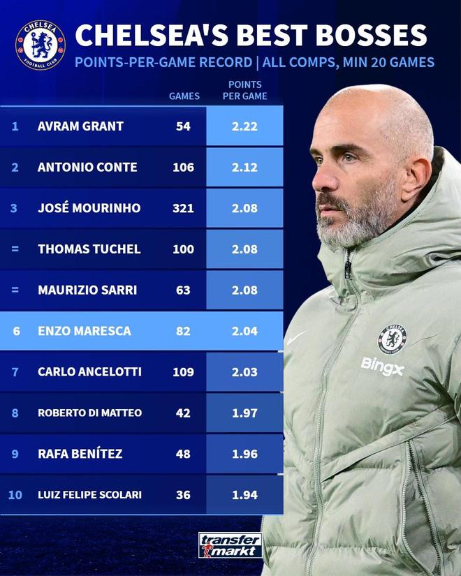 赛后来自德转的统计指出,此战取胜之后,马雷斯卡执教切尔西各项赛事82场比赛的场均积分达到了2.04分,他也就此超越了自己的同胞安切洛蒂,成为执教切尔西至少20场比赛场均积分排名第6的主教练。